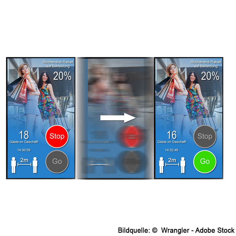 Wir möchten Sie gerne bei dieser Erfassung der Kunden unterstützen und haben einen Personenzähler als Komplett-Lösung für Sie zusammengestellt. Diese Lösung bestehend aus Display und Kamera, hilft Ihnen dabei Kunden darauf hinzuweisen, wie viele Personen gerade im Geschäft sind und stellen visuell dar, ob man reingehen darf oder nicht. Eine Signalampel auf dem Display regelt dabei die Zutrittskontrolle. Neben der Ampel können Werbeinhalte angezeigt werden. In der Wartezeit wird der Kunde auf die aktuelle Situation und die Maßnahmen hingewiesen oder über aktuelle Angebote informiert. Funktionsweise Die Zählung der Kunden erfolgt durch eine Kamera im Ein- und Ausgangsbereich, die an der Decke oder Wand befestigt wird. Das Display wird dann als visueller Zähler und Ampel genutzt. Dazu können Werbeinhalte als Bild oder Video abspielt werden. Die Einrichtung ist simpel und funktioniert in einem bereits vorhandenen Unternehmensnetzwerk oder als komplett eigenständige Lösung. Infos zur Einrichtung Die Kamera wird je nach Gegebenheiten am Ein- und Ausgang individuell montiert und muss vor Ort eingerichtet werden, um die optimale Zählung zu erreichen. Dafür stellen wir alle Bedienungsanleitungen (engl.) und Dateien für Sie bereit. Bei eventuellen Anbindungen an das vorhandene Netzwerk, muss die Einrichtung durch die zuständige IT Abteilung erfolgen. Anwendungsgebiete Das Personenzählsystem ist geeignet für Tankstellen, Supermärkte, Bäckereien, Einzelhändler, Apotheken, Arztpraxen oder Krankenhäuser. Außerdem können Werbe- oder Sicherheitsnachrichten zu einem Teil des Displays hinzugefügt werden. Diese und noch weitere Anwendungsbereiche deckt die Komplett-Lösung ab und unterstützt Sie dabei den Besucherfluss einfach zu regeln.