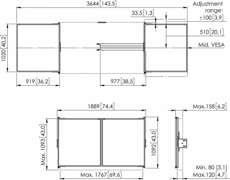 Die Whiteboards von Vogels sind für die drei gängigsten Größen von (interaktiven) Bildschirmen erhältlich: 65 Zoll, 75 Zoll und 86 Zoll. Durch die Höhen- und Tiefenverstellung des Whiteboard-Systems können die Whiteboards nahtlos an jede Art von (interaktiven) Bildschirm angepaßt werden.