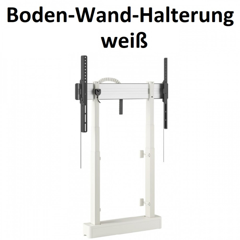 Boden-Wand-LösungDiese Variante besitzt die größte Eignung für Klassenzimmer. Die Halterung lässt sich mit nur vier Schrauben einfach, schnell und sicher installieren. Der Sockel wurde speziell so konzipiert, dass Stolpern verhindert wird. In Kombination mit der internen Kabelführung bietet die Boden-Wand-Lösung die größte Sicherheit für ihren Klassenraum. Selbst wenn Hindernisse in dem elektrischen Fahrweg, welche sich über einem simplen Tastendruck am Gerät steuern lässt, vorfinden sollten, wird die Fahrtrichtung bei Widerstand sofort umgekehrt. So sind das Display und vor allem Personen geschützt. Zusätzlich ist ein Whiteboard Tafel Set in 65, 75 und 86 Zoll als Zubehör erhältlich, um Ihnen noch mehr Platz und Möglichkeiten für das Vortragen ihrer Lehrinhalte zu ermöglichen.