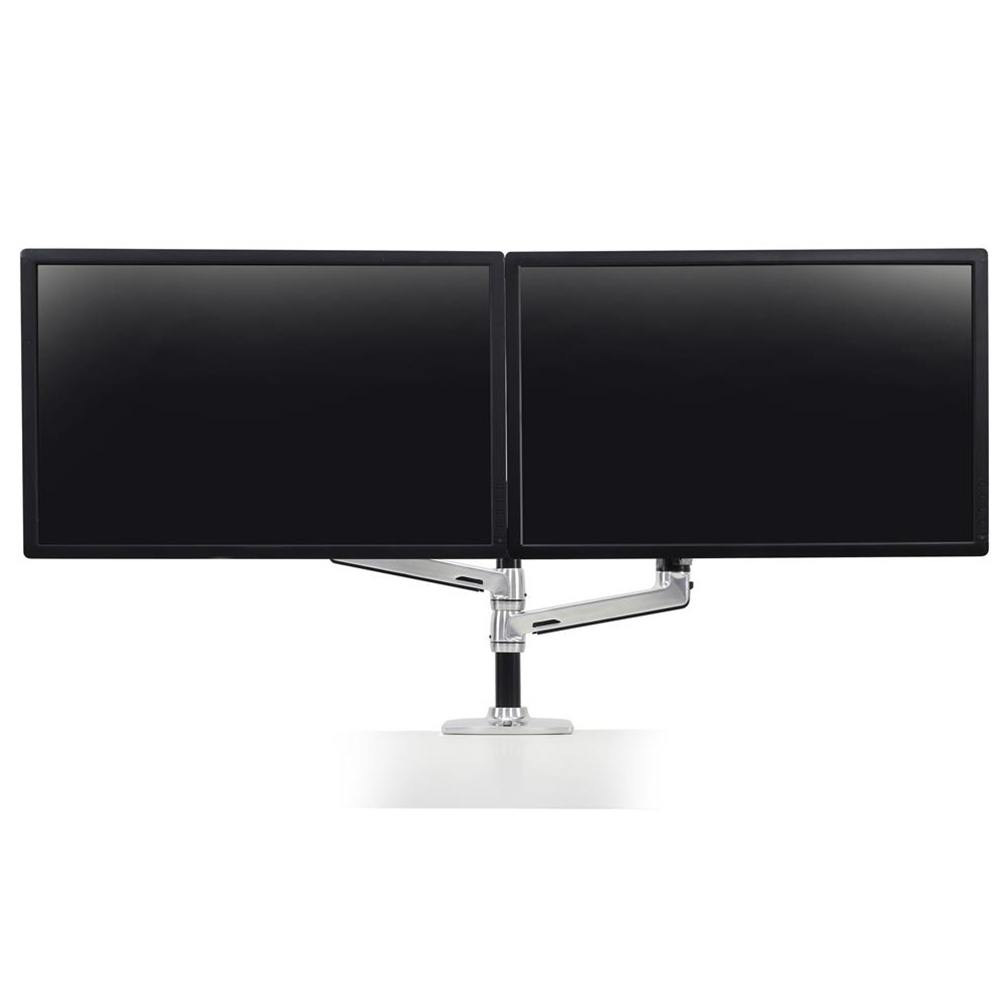 Der LX Dual Monitorarm hat eine hohe Säule, damit beide Bildschirme seperat angepasst werden können. Nach dem Arbeiten können Sie ganz einfach um mehr Platz zu haben die Monitorarme zusammenklappen oder die Monitore für eine Bildschirmpause wegschieben.