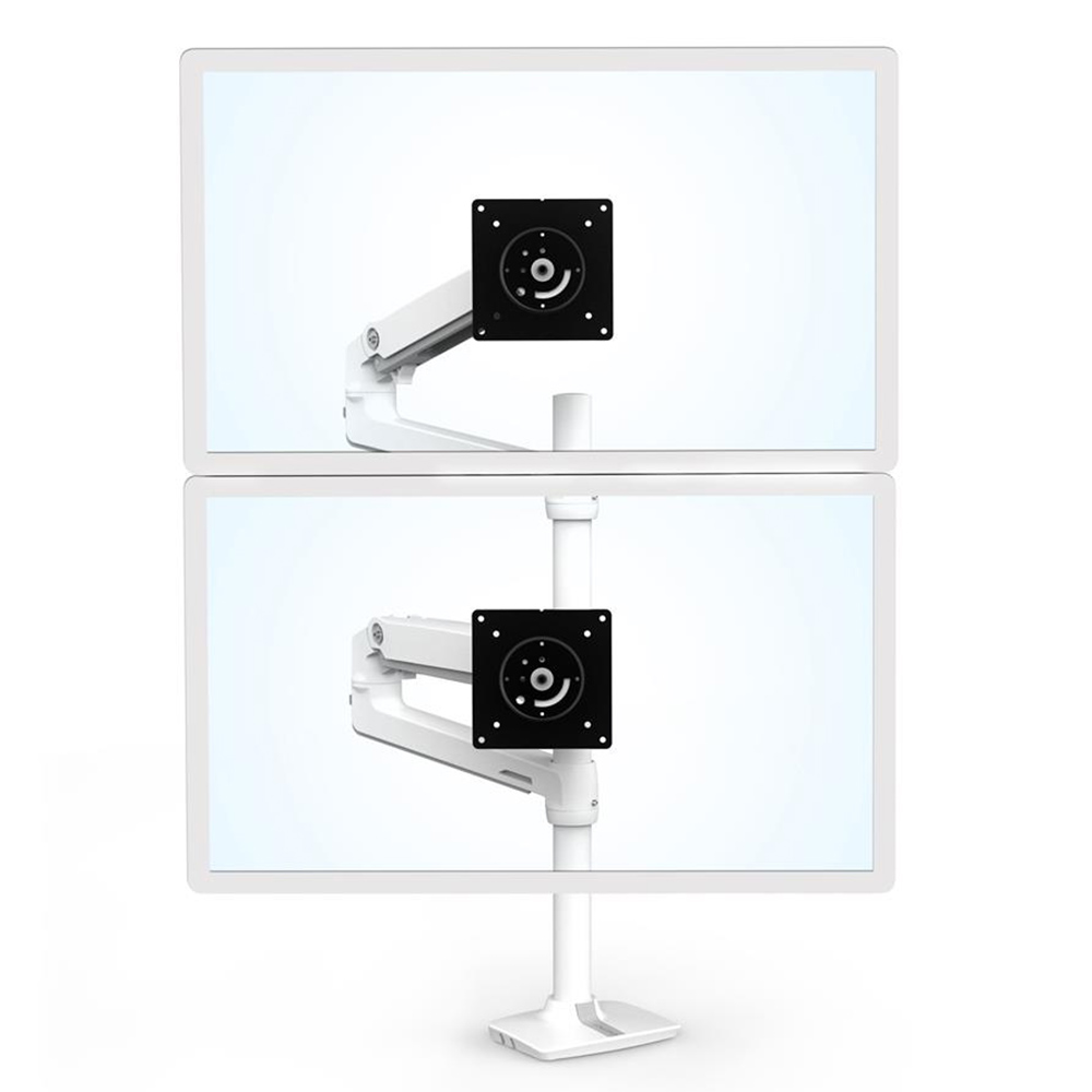 Der LX Dual Monitorarm hat eine hohe Säule, damit beide Bildschirme seperat angepasst werden können. Nach dem Arbeiten können Sie ganz einfach um mehr Platz zu haben die Monitorarme zusammenklappen oder die Monitore für eine Bildschirmpause wegschieben.
