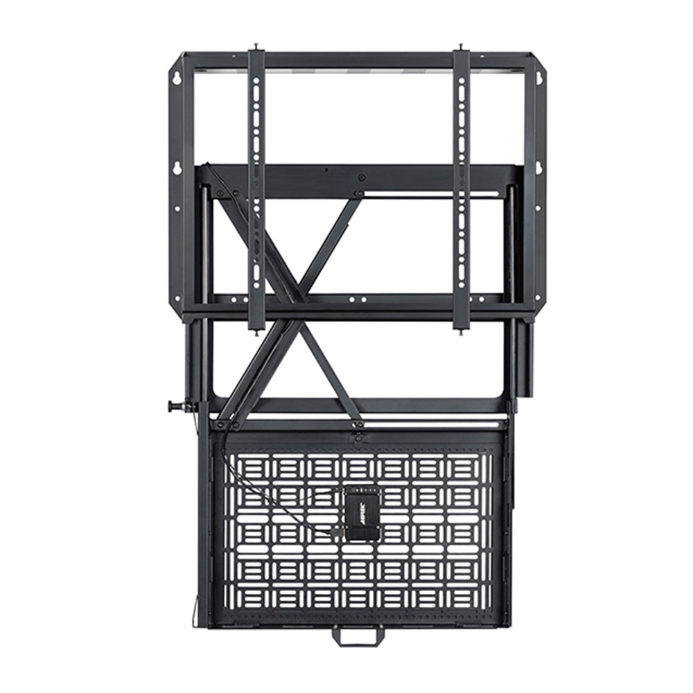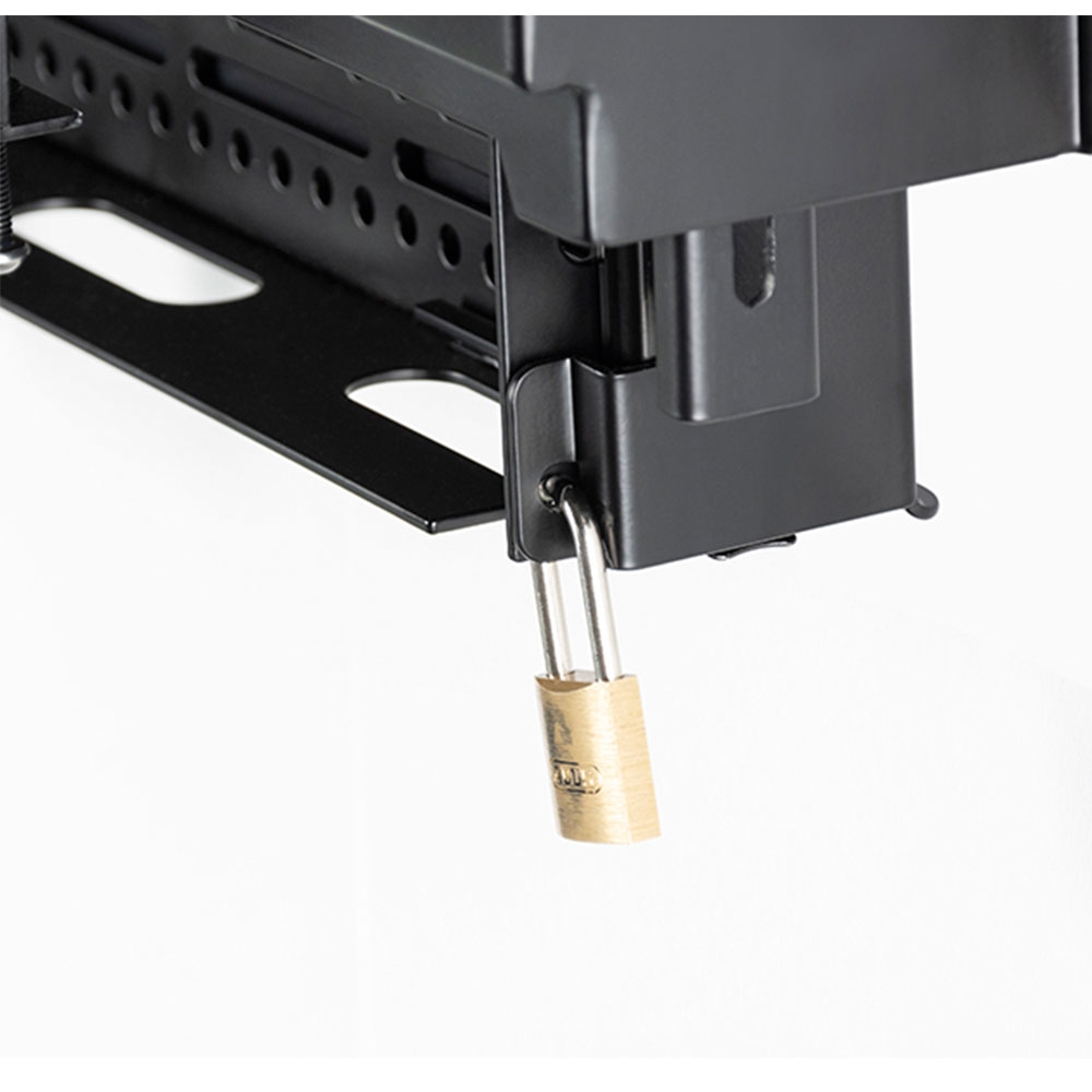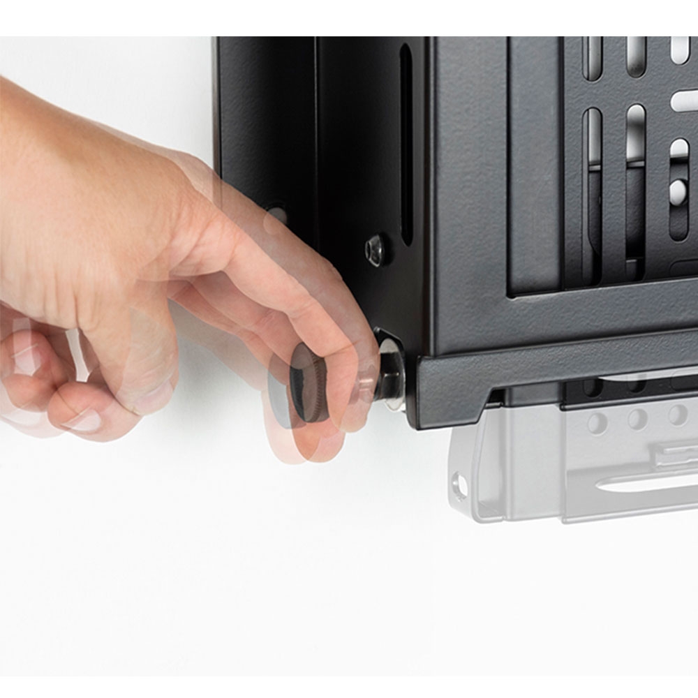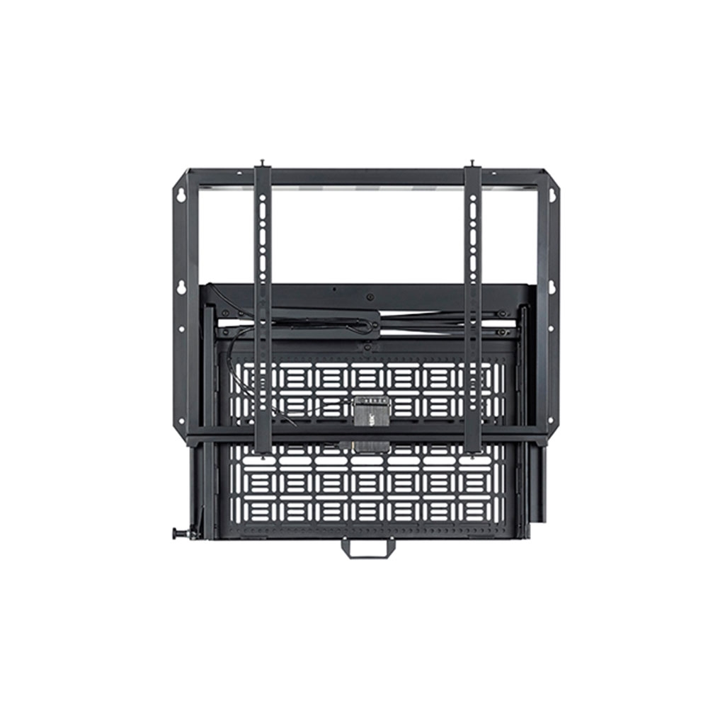 Die MM7885 ist eine Bildschirmmontagelösung mit integriertem Drop-Down-Tablett zum Aufbewahren von AV-Geräten hinter dem Bildschirm. Ausgestattet mit einer Geräteschnittstellenplatine mit Schnellverschluss, die aus der Halterung entfernt werden kann, können Sie AV-Geräte einfach hinzufügen oder aus der Installation entfernen, ohne zuerst den Bildschirm zu entfernen. Der Tray-Mechanismus erfordert kein Werkzeug und ist bequem und schnell zu bedienen. Sie können ein Vorhängeschloss (nicht im Lieferumfang enthalten) hinzufügen, um unbefugten Zugriff auf das Gerät zu verhindern. Damit sich die Kabel beim Öffnen und Schließen der Schublade nicht verheddern oder einklemmen, bewegt sich die integrierte Kabelführung mit der Schublade.